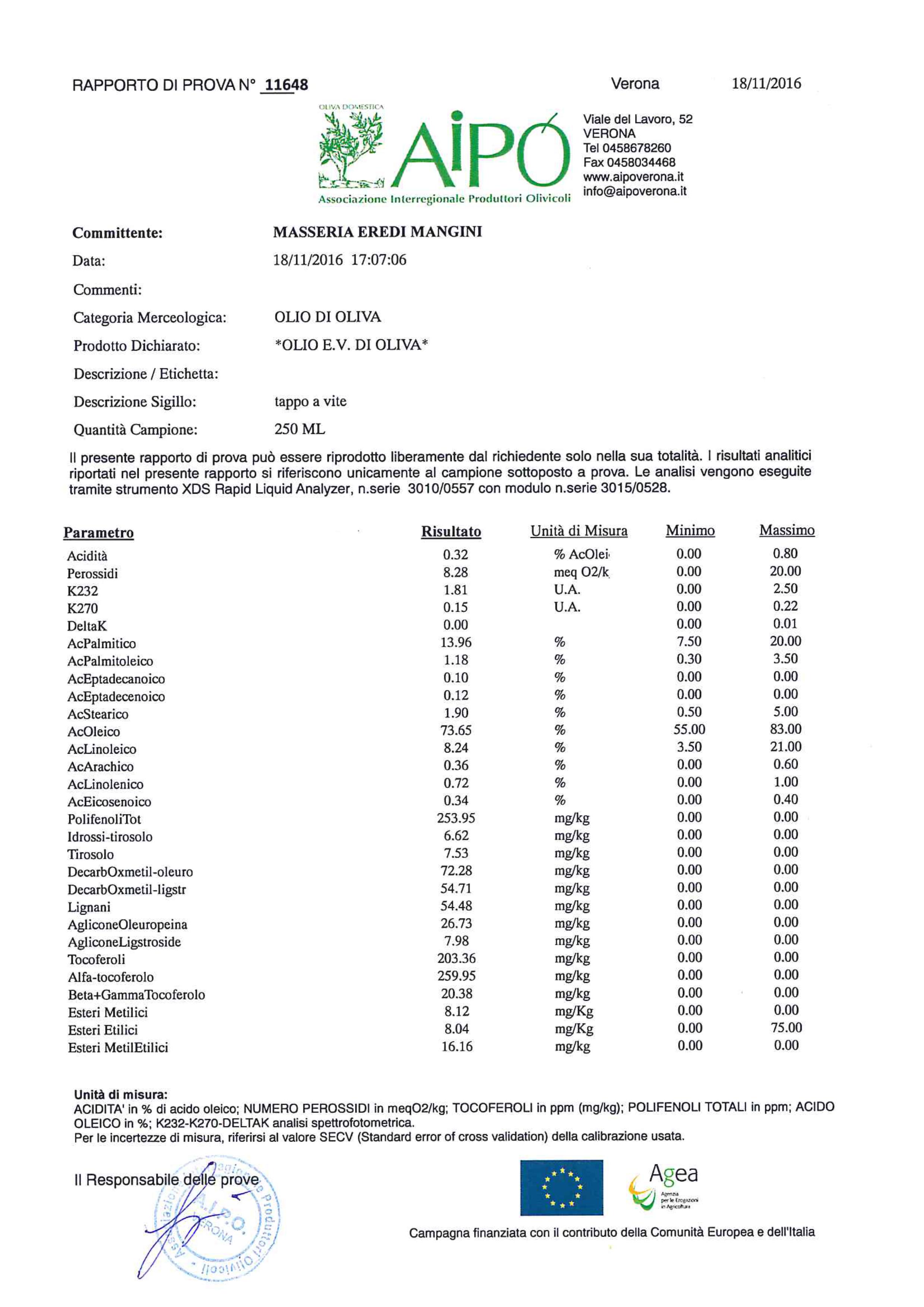 L’immagine è relativa alla certificazione del nostro olio extravergine di oliva – Produzione Novembre 2016. Ecco cosa sapere sulle analisi dell’olio
